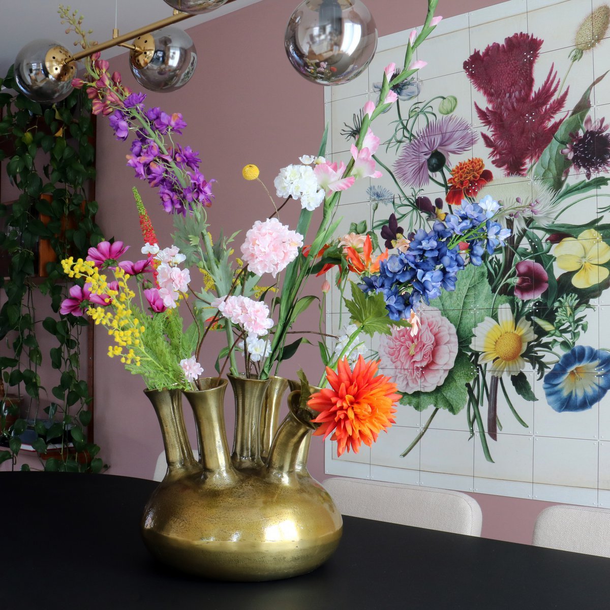 Der Trend für die kommende Saison, die Vase The World aus Horn. Mit seinen 7 „Glocken“ können Sie endlos kombinieren. Inspiriert von der Tulpenvase der Vergangenheit; jetzt ein echter Hit mit verschiedenen bunten Seidenblumen. Warten Sie nicht länger und kaufen Sie es jetzt!