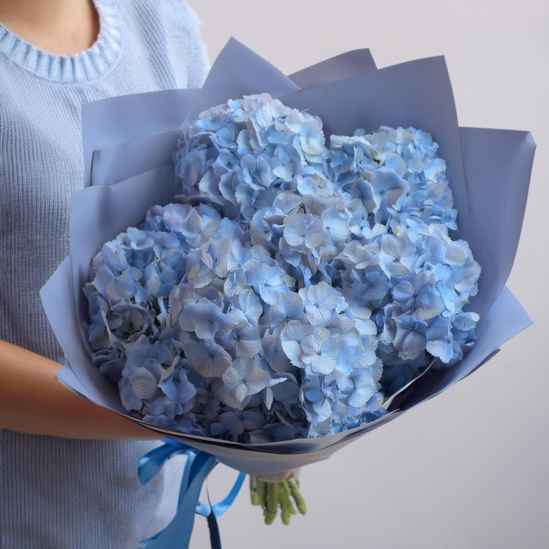 Ein Hauch von Himmel: Dieses Bouquet aus zarten, himmelblauen Hortensien strahlt Ruhe und Eleganz aus. Stilvoll in blauem Geschenkpapier verpackt, ist es die perfekte Wahl für besondere Momente und einzigartige Botschaften.