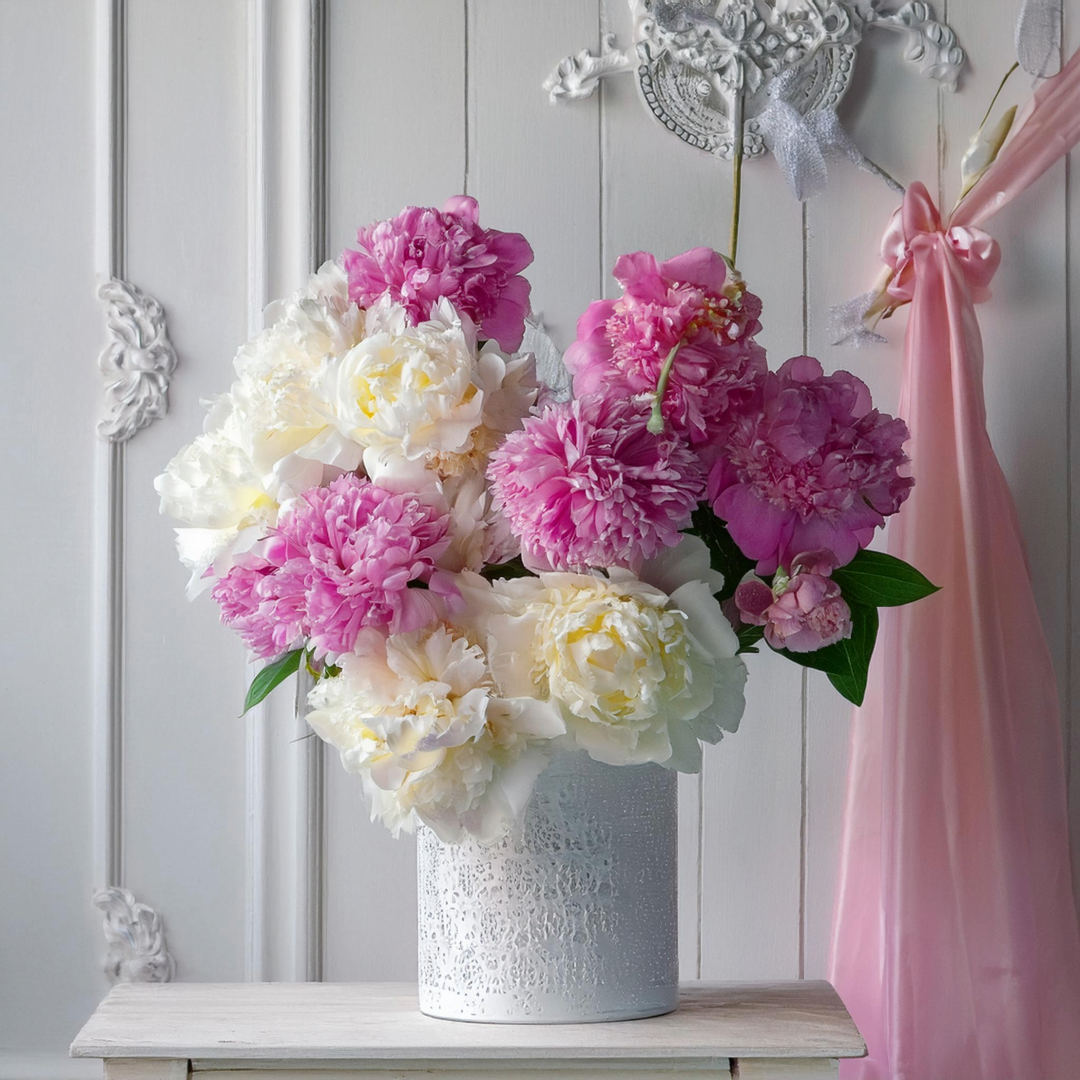 Dieser prachtvolle Strauß aus zarten rosa und cremefarbenen Pfingstrosen versprüht Eleganz und Romantik. Arrangiert in einer stilvollen weißen Vase, ist dieses Bouquet ein zeitloses Geschenk, das Gefühle auf besondere Weise ausdrückt. Ideal für unvergessliche Momente wie Hochzeiten, Jubiläen oder einfach, um jemandem eine Freude zu machen.