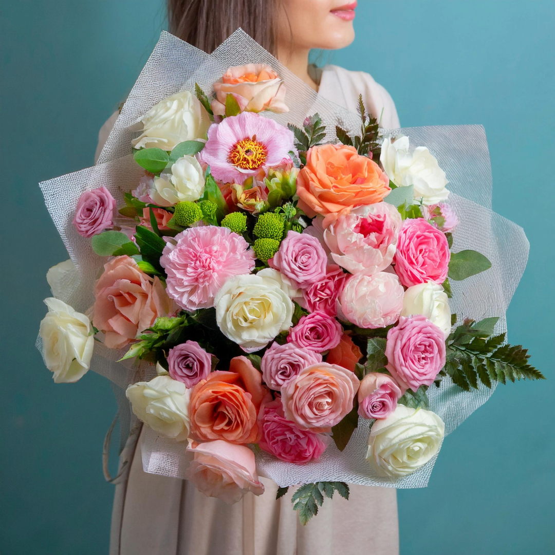 Enthält: Rosen (weiß, pink, pfirsichfarben), Pfingstrosen, Nelken, Chrysanthemen, weitere saisonale Blüten