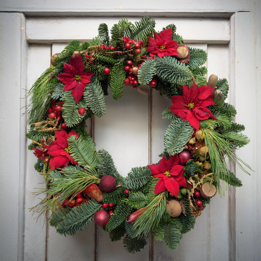 Dieser natürliche Weihnachtskranz vereint die Schönheit von frischem Tannengrün mit rustikalen Zapfen und leuchtend roten Beeren. Dekoriert mit tiefgrünen Blättern und Akzenten von glänzenden, roten Früchten, bringt dieser Kranz die festliche Atmosphäre direkt in Ihr Zuhause. Ideal für Türen oder Wände und perfekt, um eine warme, weihnachtliche Stimmung zu erzeugen.