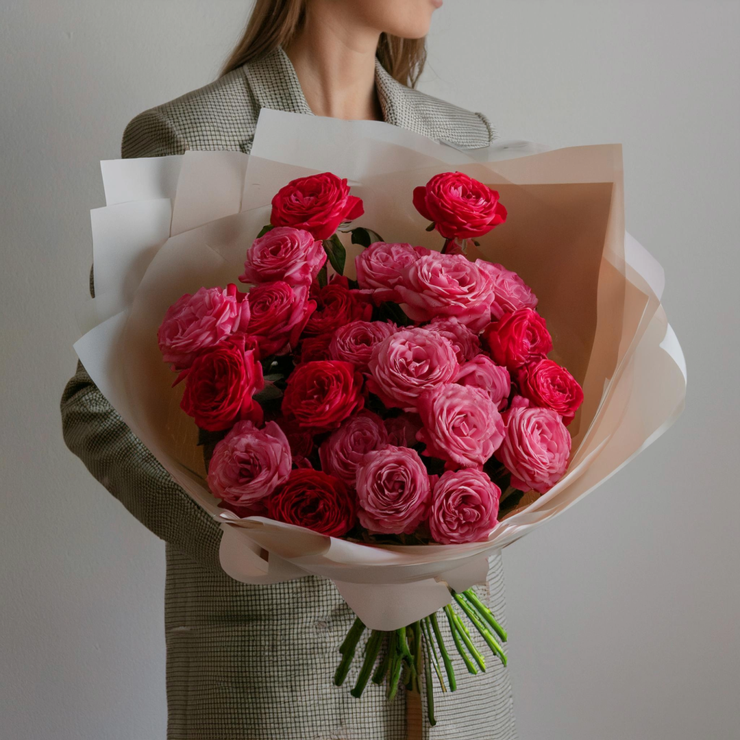 Ein Bouquet voller Leidenschaft und Eleganz! Die leuchtenden Rottöne und zarten Rosa-Schattierungen der Rosen machen dieses Arrangement zu einem echten Highlight. Perfekt für besondere Momente, die von Herzen kommen.