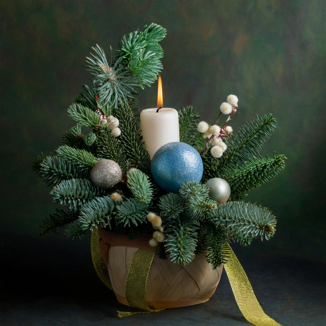 Ein stilvolles Weihnachtsgesteck, das mit frischen Tannenzweigen, einer weißen Kerze und glänzenden blauen und silbernen Kugeln für eine warme, festliche Atmosphäre sorgt. Perfekt als Tischdekoration oder Geschenk