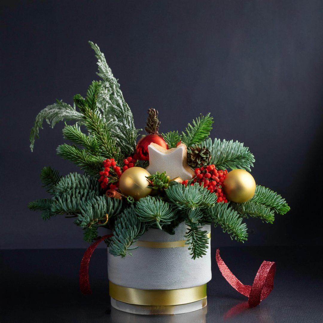 Ein charmantes Weihnachtsgesteck in Rot und Gold, das durch den dekorativen Stern und frische Tannenzweige überzeugt. Perfekt als festliche Tischdeko oder als Geschenk geeignet.