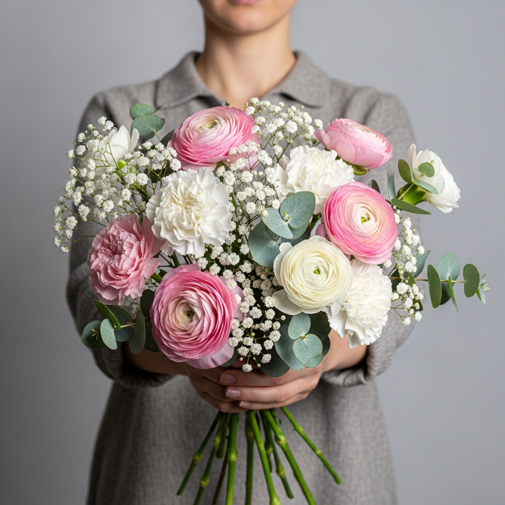 Dieser zarte und romantische Blumenstrauß vereint pastellrosa Ranunkeln mit weißen Nelken und Schleierkraut, umrahmt von frischem Eukalyptusgrün. Die weich fließenden Blütenformen und die sanfte Farbpalette verleihen dem Arrangement eine verträumte, fast poetische Ausstrahlung. Eingehüllt in roséfarbenes Seidenpapier und mit Schleifenband veredelt, ist dieser Strauß ideal für romantische Anlässe, Hochzeiten oder als liebevoller Gruß für einen besonderen Menschen. Ein florales Kunstwerk voller Eleganz und Sanftheit.