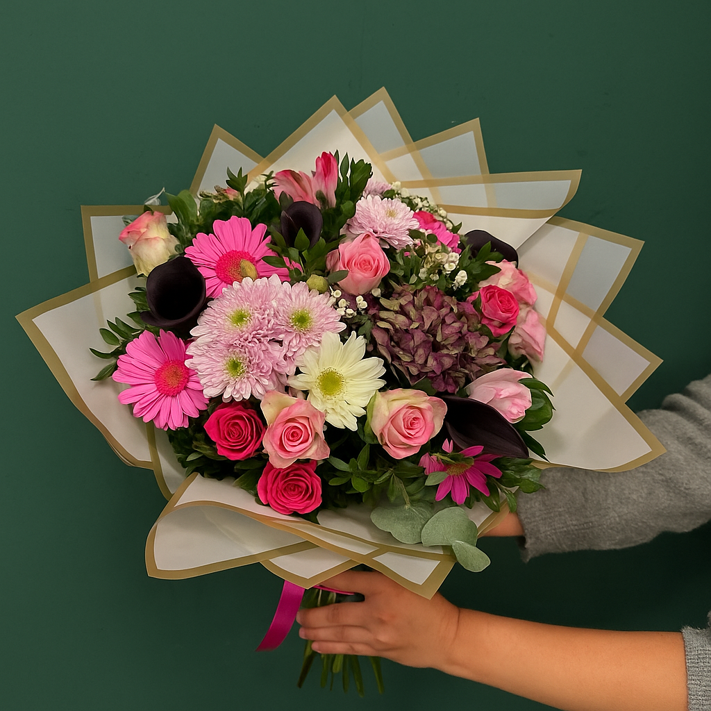 Ein ausdrucksstarker Strauß in kräftigen Rosé-, Lila- und Creme-Tönen – mit Rosen, Chrysanthemen, Gerbera, Calla und Hortensien. Diese Komposition ist sowohl romantisch als auch modern und bringt frische Energie in jeden Raum. Ideal als Geschenk für Geburtstage, Jubiläen oder um einfach Freude zu bereiten.